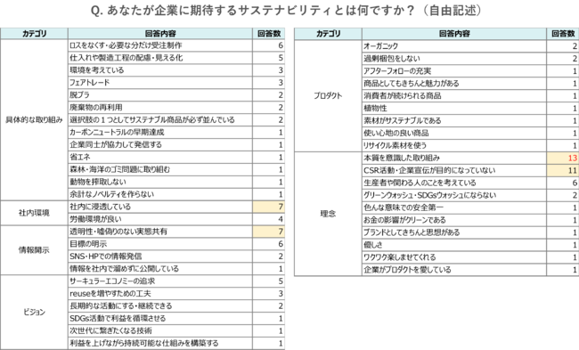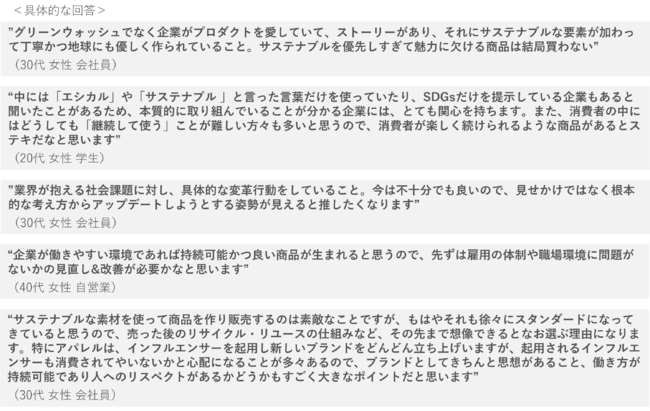また、サステナブル素材を使用することの他に『企業に期待するサステナビリティとは何か(※自由記述)』について聞くと、「本質を意識した取り組み」「CSR・企業宣伝が目的になっていない」という回答が多くなりました。また、「透明性・嘘偽りない実態共有」も多く求められています。他にも、「商品自体の魅力」や「社内環境」に関する内容などもあり、理念・ビジョンから具体的な取り組みまで幅広い回答が得られました。