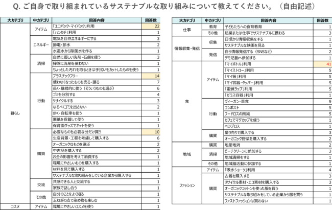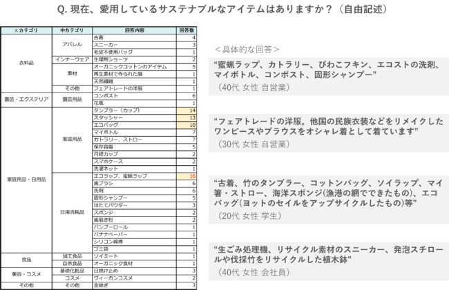 また『現在愛用しているサステナブルなアイテム(※自由記述)』について聞くと、「エコラップ、蜜蝋ラップ」が最も多く、他にも「タンブラー」や「スタッシャー」、「エコバッグ」など、家庭用品・日用品の中で使い捨てに繋がるものを、サステナブルなアイテムに置き換えている人が多いことが分かりました。そのほかにも、「フェアトレードの洋服、リメイクした衣服」や「生ごみ処理機、発泡スチロールや伐採竹をリサイクルした植木鉢」など、自身のライフスタイルや興味・趣味に合わせてサステナブルなアイテムを取り入れていることが伺えました。