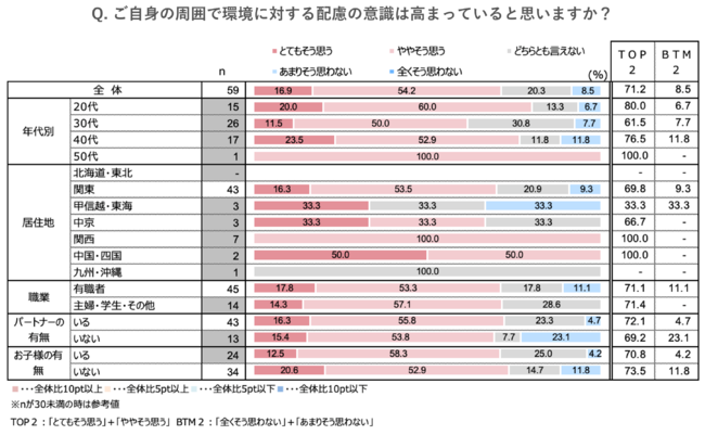 自身の日常生活や身の回りで、自然環境の破壊や温暖化の影響を実際に体感したり、またそれらに関連する取り組み等も目にすることが多く、それが前述の『サステナビリティと聞いて思い浮かぶもの』という質問で「環境汚染・温暖化・異常気象」の回答率が高い理由に繋がっていると考えられます。