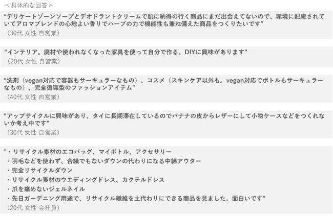 さらに、『サステナブルな素材を使ってつくりたいライフスタイルアイテムはありますか?(※自由記述)』と聞いたところ、幅広い回答の中でも衣料品の「ファッション用品」が最も多く、次いで日用消耗品の「洗剤」「掃除用品(スポンジ、雑巾、掃除スプレー)」が多い結果となりました。