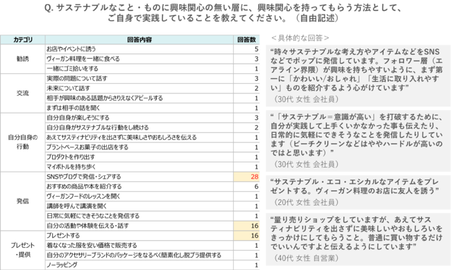 さらに『サステナブルなコト・モノに興味関心の無い層に、興味関心を持ってもらう方法として、ご自身で実践していることを教えてください(※自由記述)』と伺ったところ、「SNSやブログで発信する・シェアする」が最も多く、次いで「自分の活動や体験を伝える・話す」「プレゼントする」が2番目に多い結果となりました。情報発信する際には、押しつけないように意識して相手に興味を持ってもらえるよう発信している方が多いことが伺えました。他にも「プロダクトを作り出す」「自分自身が楽しそうにする」など「自分自身の行動」に関する回答も複数見られました。