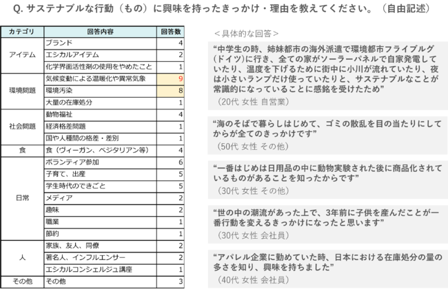 元々サステナブルなコト・モノへの関心が強いELEMINIST followersの皆さまですが、『サステナブルな行動(モノ)に興味も持ったきっかけ・理由を教えてください(※自由記述)』という質問では、具体的なストーリーとして以下(図表右)のような回答が得られました。