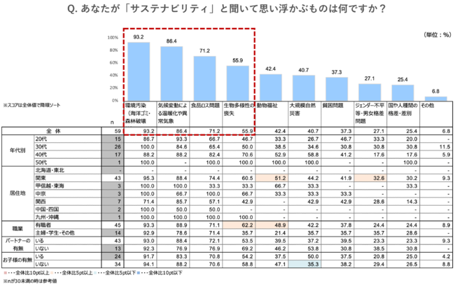 『サステナビリティと聞いて思い浮かぶものは何ですか?(※複数回答)』という質問では、全体の約93%が「環境汚染」と回答。他にも「気候変動による温暖化や異常気象」が86%、「食品ロス問題」が71%、「生物多様性の喪失」が55%と回答していました。