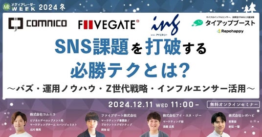 株式会社ラバブルマーケティンググループ(本社:東京都港区、代表取締役社長:林雅之、証券コード:9254)の子会社で、企業のSNSマーケティング支援事業を行う株式会社コムニコ(本社:東京都港区、代表取締役:長谷川 直紀、以下 コムニコ)は、12月11日(水)11時~、媒体資料ポータルサイト「メディアレーダー」が開催するマーケティングセミナーイベント「第16回 メディアレーダー WEEK 2024 冬」の中で行われるオンラインセミナー「SNS課題を打破する必勝テクとは?~バズ・運用ノウハウ・Z世代戦略・インフルエンサー活用~」に登壇いたします。