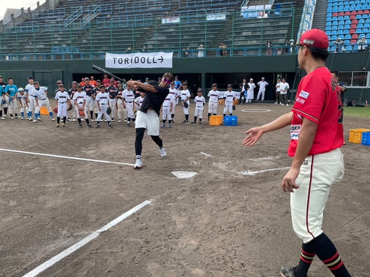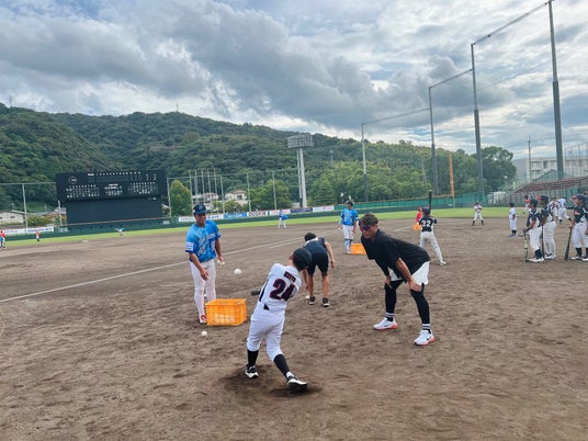 試合前には、阪神タイガーススペシャルアンバサダーの糸井嘉男氏、四国アイランドリーグで活躍する選手をお招きした「こども野球教室」を開催しました。徳島の少年野球チームなど約50名のこどもたちとティーバッティングを実施し、糸井氏や選手たちから打撃のコツなどをアドバイスいただきました。