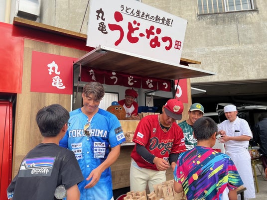 また、開場に合わせて丸亀製麺の人気商品「丸亀うどーなつ」を先着300名のお客様に無料提供しました。お客様へのご提供には糸井氏、四国アイランドリーグ選手にもご協力いただき、お客様からは喜びの声をいただきました。メモリアルピッチには、昨シーズンまで高知ファイティングドッグスで4番打者として活躍し、今年4月にトリドールHDに入社、現在は丸亀製麺 江戸川春江店店長を務める鳥井弘樹が登場しました。トリドールHDは四国アイランドリーグのセカンドキャリア支援にも取り組んでおり、四国アイランドリーグから当社への入社は鳥井が初めてとなります。