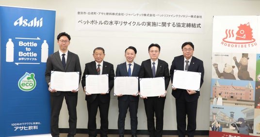 株式会社JEPLAN(代表取締役 執行役員社長:高尾 正樹、以下「JEPLAN」)のグループ会社であるペットリファインテクノロジー株式会社(代表取締役 執行役員社長:伊賀 大悟、以下「ペットリファインテクノロジー」)は、登別市(市長:小笠原 春一)、白老町(町長:大塩 英男)、アサヒ飲料株式会社(代表取締役社長:米女 太一、以下「アサヒ飲料」)、ジャパンテック株式会社(代表取締役社長:古澤 栄一、以下「ジャパンテック」)、とともに、日本国内のPETボトルの循環利用の推進を目的とした「ペットボトルの水平リサイクルの実施に関する協定書」を2月12日(木)に締結しました。また、同日に協定書に署名をする締結式を行いましたので、お知らせします。