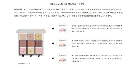 しっかりと発色させたいときにはパウダーを置くように塗布。ふんわりと発色させたいときには、指やブラシで磨くように塗布するとパールの輝きを引き立たせながら、肌なじみの良いやさしい色彩を楽しめます。