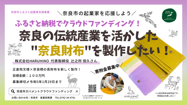 令和4年度の挑戦事業者(起業家)の、株式会社HARUHINOの辻之所 恒久さんが、奈良の伝統産業を活用した"奈良財布"の製作に挑戦します!