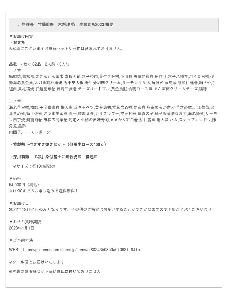 GLIONグループ(ジーライオングループ 所在地:兵庫県神戸市)は、同グループが運営する京都の完全紹介制の料亭 京料理 箔(所在地:京都府京都市中京区)にて2022年10月1日(土)より数量限定で料理長 竹嶋監修の生おせち2023のご予約を開始いたします。