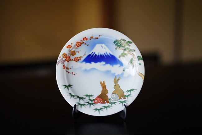 深川製磁の干支皿は、昭和初期1930年頃から毎年安寧を願い制作して参りました。令和5年は癸卯(みずのとう)の年です。平和を愛する人の干支と言われています。縁起物の象徴である松竹梅を錦絵(上絵)で描き、永遠の発展を象徴する末広がりの富士山を深川製磁独自の染付のグラデーションで描いております。また、兎には梅に「青海波文」と「亀甲文」を配し、全て吉祥文様で仕上げております。