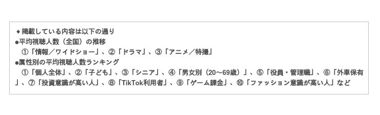 加えて、関東、関西などの放送局の免許エリア単位ではなく、全国規模でテレビCMを出稿されているアドバタイザー視点で、全国での番組視聴人数を集計しています。