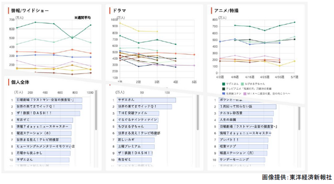 株式会社インテージ(本社:東京都千代田区、代表取締役社長:檜垣 歩、以下インテージ)は、株式会社東洋経済新報社(本社:東京都中央区、代表取締役社長:田北 浩章)が運営するビジネスニュースサイト「東洋経済オンライン」にデータ提供し、「民放5系列番組・全国視聴人数ランキング」を公開しました。