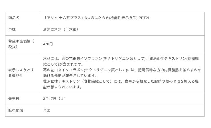 アサヒ飲料株式会社(本社 東京、社長 岸上 克彦)は、「十六茶」ブランドから“いいもの16素材を絶妙なバランスでブレンドした「十六茶」”に健康機能価値を付与した「十六茶プラス」シリーズを展開します。その第一弾として「3つのはたらき」をもつ機能性表示食品『アサヒ 十六茶プラス 』3つのはたらき630」PET630ml「『アサヒ 十六茶プラス 』3つのはたらき」PET2Lを全国で3月17日(火)より新発売します。