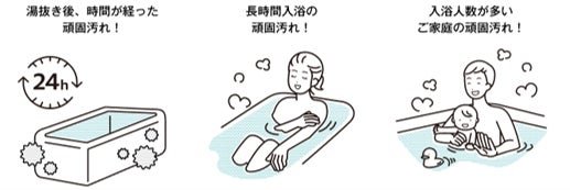 一方、従来の「こすって洗う」方法を続ける人の多くは、湯抜き後の「長時間放置したときの汚れ」や「入浴人数が多い家庭の汚れ」について、「こすらないと落ちない」と認識していることが明らかになりました(※2)。そして実際に、これらの汚れは頑固になっていることが判明しました。