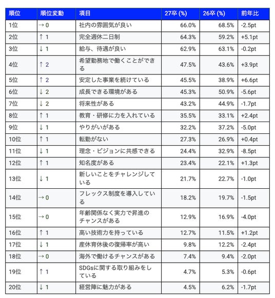 前年(26卒)との比較で見ると、「完全週休二日制(+5.1pt)」や「安定した事業(+6.6pt)」がポイントが増加。一方で、「理念・ビジョン(-8.5pt)」や「成長できる環境(-5.6pt)」は減少しました。