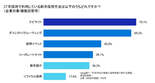 27卒採用において企業が利用している手法は、「ナビサイト(73.1%)」と「ダイレクトリクルーティング(69.2%)」の2つが多いようです。かつては「ナビサイト」が主流の採用手法でしたが、現在は会いたい学生に直接アプローチする「ダイレクトリクルーティング」とのハイブリッド型の運用がスタンダードになりつつあることがわかります。