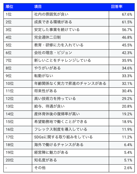- 学生が魅力に感じるトップ3は「社内の雰囲気が良い」「完全週休二日制」「給与、待遇が良い」