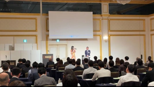 事業発表会で100名以上の社員の前でサプライズ生披露、会場に大きな拍手が響く。