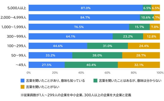 企業規模別にみると、大企業では「エンゲージメントについて言葉を聞いたことがある」が90%程度、中小企業では70%程度と認知度が高いことが分かりました。加えて、大企業では「言葉の意味も知っている」企業がすでに70%近く、「エンゲージメント」という言葉が働く現場に浸透していることがうかがえます。