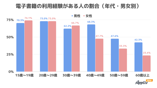 「現在利用している」「過去に利用していた」と回答した電子書籍の利用経験者の割合を、男女・年代別で見てみると最も多いのは10代の女性。