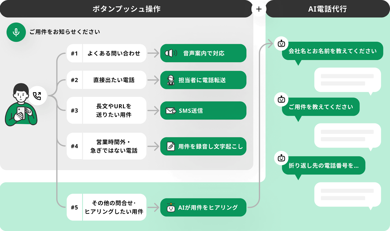 誤情報を返さない独自技術 "ハルシネーションゼロ" により、業務自動化の信頼性も担保。オートコールと有人対応とのハイブリッド運用にも対応し、通話データを起点とした継続的な業務改善と、データドリブンな意思決定を支援します。