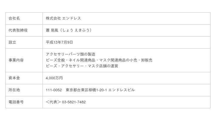 株式会社エンドレスでは、「アクセサリーをつくる楽しさと身に着ける喜びを世界中の方に届けたい」というスローガンのもと、ビーズ&アクセサリーパーツショップ「PARTS CLUB」、ハイクオリティ・ロープライスのアクセサリーショップ「LUNA EARTH」、サステナビリティに貢献するため商品の販売経路拡大を目的としたアウトレットブランド「ruinas OUTLET」等を運営しています。