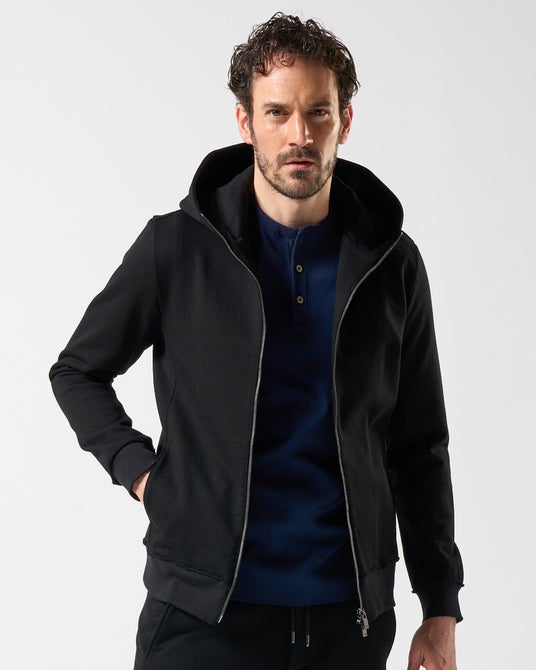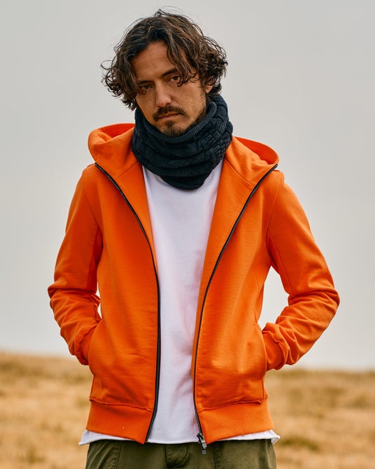 スタンダードなジップフーディ。フーディに重要な収まり、かぶりを計算したフードパターン。フードに沿うようなジップアップがフード部分の美しい形状をキープ。程よい高さとボリューム感のハイネック、随所に施した断ち切り仕様が、ミニマルなデザインのアクセントに。デイテールデザインを極力そぎ落とし、シルエットの美しさを強調。