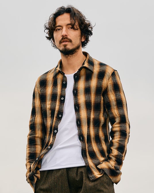 wjkのアイコンとも言えるシャツアイテムであるシワ加工シャツ。特殊な樹脂に浸し、ねじりを入れて乾燥させることで施されるシワ加工は、着用の際絶妙なフィット感でラインを作り出し、男らしいシルエット形成を実現する。