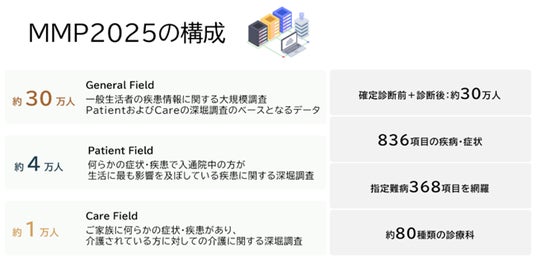 MMPは、大規模な疾患情報パネルであり、2018年から毎年約30万人の生活者が参加しています。特に、過去1年以内に入通院歴のある約11.3万人、入通院歴のない約19.5万人、さらに介護を行っている約1万人が含まれ、多様なヘルスケアの状況をカバーしています。
