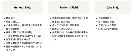 800を超える症状・疾患情報の収集を行っており、特定の疾患からその周辺症状まで広範囲のデータが分析可能です。生活の質(QOL)や年収といった情報も収集しており、電子カルテやレセプトデータには含まれない貴重なデータが得られます。