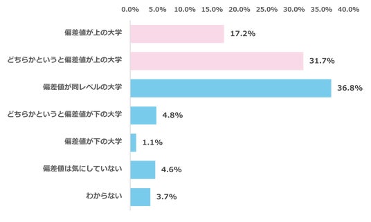 次に、推薦系選抜の受験を予定・検討していると回答した435名を対象に、子どもが推薦系選抜を受験する場合、現在の偏差値よりも上の大学を志望するか質問しました。その結果、 48.9%が「偏差値が上の大学」(偏差値が上の大学:17.2%、どちらかというと偏差値が上の大学:31.7%)、36.8%が「偏差値が同レベルの大学」と回答しました。