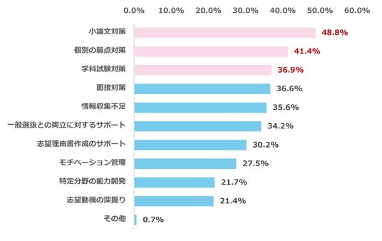 また、学校の授業だけでは不安を感じると回答した295名を対象に、どのような不安を感じるか質問しました。その結果、最多回答は「小論文対策(48.8%)」、次いで「個別の弱点対策(41.4%)」、「学科試験対策(36.9%)」と続きました。