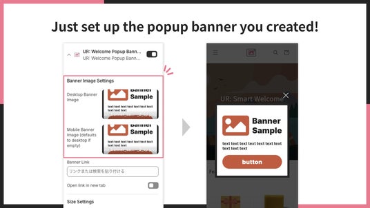 バナー画像を設定するだけで設定は完了。複雑な設定項目はなく、ポップアップの内容は視覚的に確認しながら編集できます。バナー画像には新商品の情報、割引キャンペーン、メール登録の誘導など、自由なデザインが可能です。