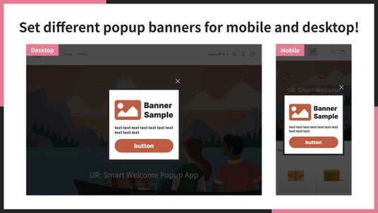 「UR: Welcome Popup Banner App」は、ストア訪問者に向けてポップアップでバナー画像を表示する海外向けの Shopify アプリです。画像の設定や表示タイミングはすべてノーコードで簡単に管理でき、初回訪問時の訴求、クーポン配布、メール登録促進などに活用できます。PC・スマホで異なる画像を設定できるため、ユーザーに応じた訴求が可能です。再訪問時の表示間隔も細かく調整でき、コンバージョン向上に貢献します。