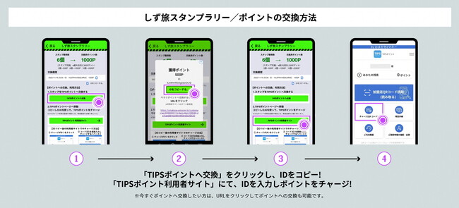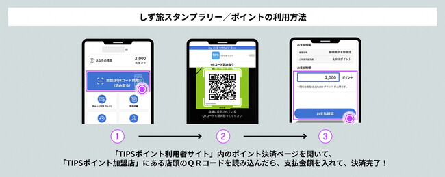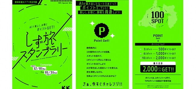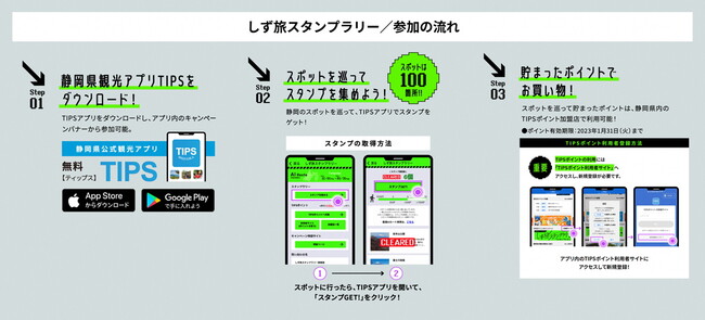 ・概要:静岡県公式観光アプリ「TIPS」(ティップス)を使用して、あらかじめ設定されたスポットを巡ってデジタルスタンプを集め、その数に応じて参加加盟店で利用可能な「TIPSポイント」を最大2,000円分獲得することが可能な静岡県独自の観光周遊促進イベント。