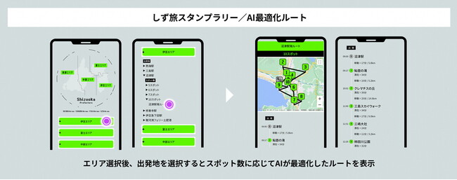 本インベントは、設定されたスポットを多く回った方がより多くのポイントを獲得できます。そのため、静岡県内をより効率良く周遊するルートとして、過去の旅行者データに基づき、AIが作成したルートを提案するコンテンツを特設ページ内に設置。周遊ルートを検討する際にご活用いただけます。