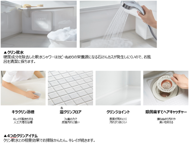 汚れを発生させにくい「クリン軟水」と、カビや汚れをこびり付かせない4つのクリンアイテムでお風呂のキレイが続きます。