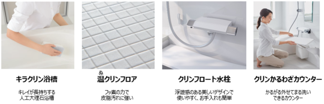 キレイが長持ちする人工大理石浴槽「キラクリン浴槽」、フッ素の力で皮脂汚れに強い「温(ぬ)クリンフロア」など、カビや汚れをこびり付かせないクリンアイテムやお掃除のしやすいアイテムでお風呂のキレイが続きます。