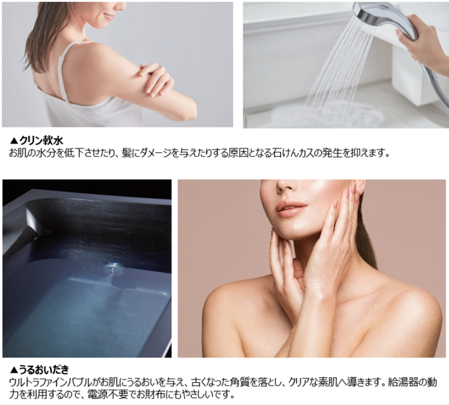 保湿効果が高く、お肌しっとり、髪の毛サラサラが期待できる「クリン軟水」と、直径1ミクロン未満の超微細なウルトラファインバブルの入浴が楽しめる「うるおいだき」が基本仕様。いつものように入浴するだけでお肌のお手入れができるスタイルです。