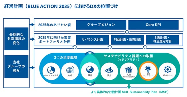 当社グループでは、経営計画「BLUE ACTION 2035」 https://ir.mol.co.jp/ja/ir/management/plan.html において、「サステナビリティ課題」 https://www.mol.co.jp/sustainability/management/issues/ への取組のうちの最重点5項目の1つとして、「DX」を掲げています。2023年3月にはその目指す姿を示す「商船三井グループDX Vision」 https://www.mol.co.jp/sustainability/innovation/dx/ を策定し、ビジネスとカルチャーの両面から変革を進めています。また、その実行計画である「DX Action」に毎年見直しを加えながら、徹底的なデジタル化と業務・組織の最適化を行っています。