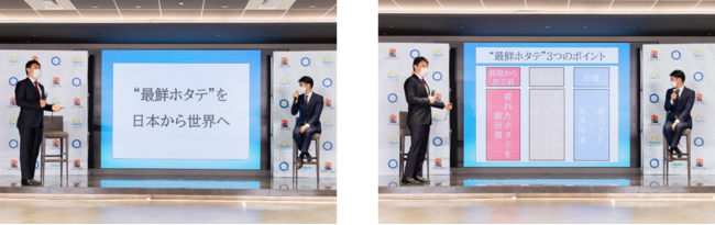 「AIセレクタ」の発表に加え、「獲れたてより“新鮮”、獲れたてより“美味しい”」をコンセプトに、急速凍結のハイブリッドアイスやマイクロバブル(製造:株式会社ヤマザキ)等を利用して製造する「最鮮シリーズ」の第1弾として、「最鮮ホタテ」をHL社ブランドとして、2022年6月にHL社が運営する EC サイト「ご当地こわけ(https://www.kowake.shop/)」にて発売予定であることも発表。6月に竣工予定の約5億円をかけ増設した工場で最鮮ホタテを製造し、3年以内には、EUを中心とした海外へ輸出することを目指していると言い「高品質な素晴らしい日本の水産品のおいしさを世界へお届けする予定。」と意気込みを話しました。(最鮮ホタテサイト:https://www.saisenhotate.com/)