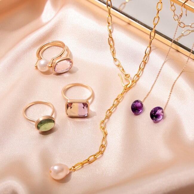 バーニーズ ニューヨークのラグジュアリーな雰囲気を楽しむお客様に合わせ、シンプルで厳選した色とりどりの良質な天然石やパールをセレクトしました。素材もK10のイエローゴールドやシルバー925素材などを使っているため安心して長くお使いいただけます。
