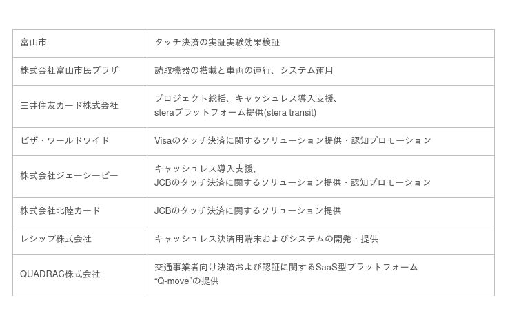 富山市、株式会社富山市民プラザ(本社:富山県富山市、代表取締役社長:京田 憲明)、三井住友カード株式会社(本社:東京都江東区、代表取締役社長:大西 幸彦)、ビザ・ワールドワイド・ジャパン株式会社(本社:東京都千代田区、代表取締役社長:スティーブン・カーピン)、株式会社ジェーシービー(本社:東京都港区、代表取締役会長兼執行役員社長:浜川 一郎)、株式会社北陸カード(本社:富山県富山市、代表取締役社長:南 直樹)、レシップ株式会社(本社:岐阜県本巣市、代表取締役社長:杉本 眞)、QUADRAC株式会社(本社:東京都港区、代表取締役社長:高田 昌幸)は、富山駅から中心市街地の移動手段として利便性の高い『まいどはやバス』において、三井住友カードが提供する公共交通機関向けソリューション「stera transit」を活用し、2023年4月3日よりfVisa・JCBのタッチ決済の実証実験を開始することを以下の通りお知らせします。