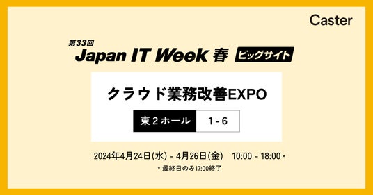 株式会社キャスター(本社:宮崎県西都市、代表取締役 中川祥太、以下「キャスター」)は、2024年4月24日(水)~ 4月26日(金)の3日間、東京ビッグサイトで開催される日本最大のIT・DX展示会「Japan IT Week【春】」クラウド業務改善EXPOに出展いたします。