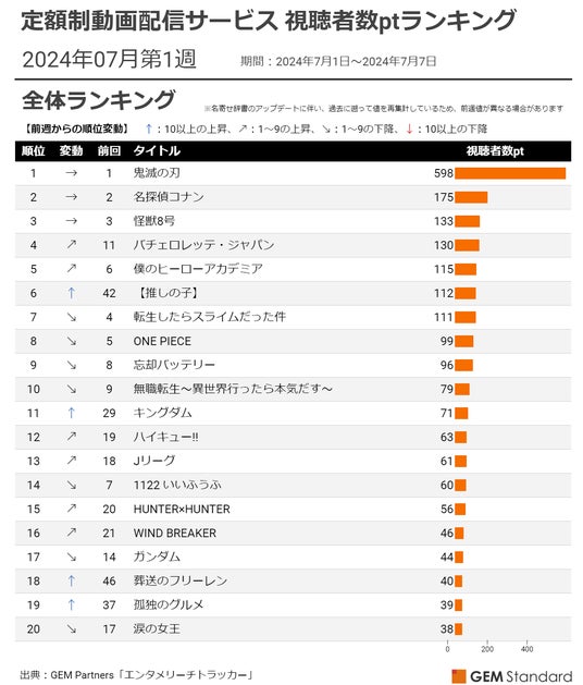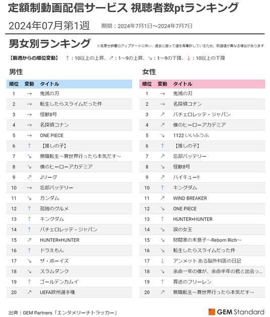 エンタテイメント業界に向けたデータ×デジタルマーケティングサービスを提供するGEM Partners株式会社(ジェムパートナーズ、所在地:東京都港区、代表取締役:梅津文)は7月10日、複数の定額制動画配信サービスを横断集計した2024年7月第1週(2024年7月1日~2024年7月7日)のコンテンツ別(※1)視聴者数ptランキング(全体・男性・女性)を発表します。