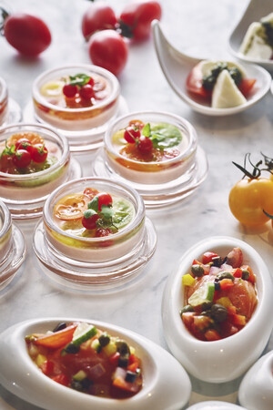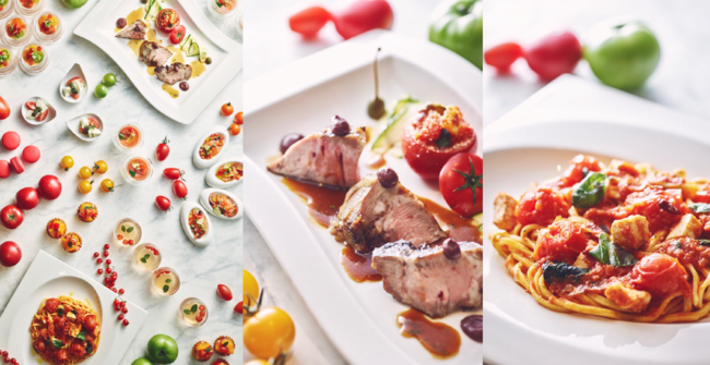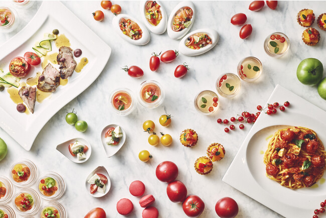 トマト尽くしを召し上がれ。15種の前菜と10種のデザートをお好きなだけ!