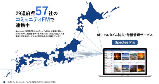 このような背景から、Specteeは2023年7月からコミュニティFMとの連携を開始し、AIリアルタイム危機管理サービス『Spectee Pro』を通して災害情報を提供することで地域の防災力向上に貢献しています。