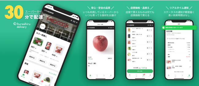 Web・モバイルアプリで注文すると、配達員が指定されたスーパーでピッキングを行い、最短30分でご指定の配達先までお届けします。