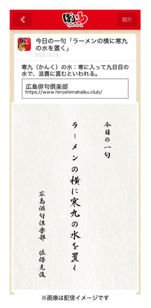 広島俳句倶楽部の会員が詠んだ句を、「今日の一句」として、ばり嗎のスマートフォンアプリで毎日配信いたします。季節ごとにうつろう情景と、そこにあるラーメンの温かさを感じる俳句を楽しみにお待ち下さい。